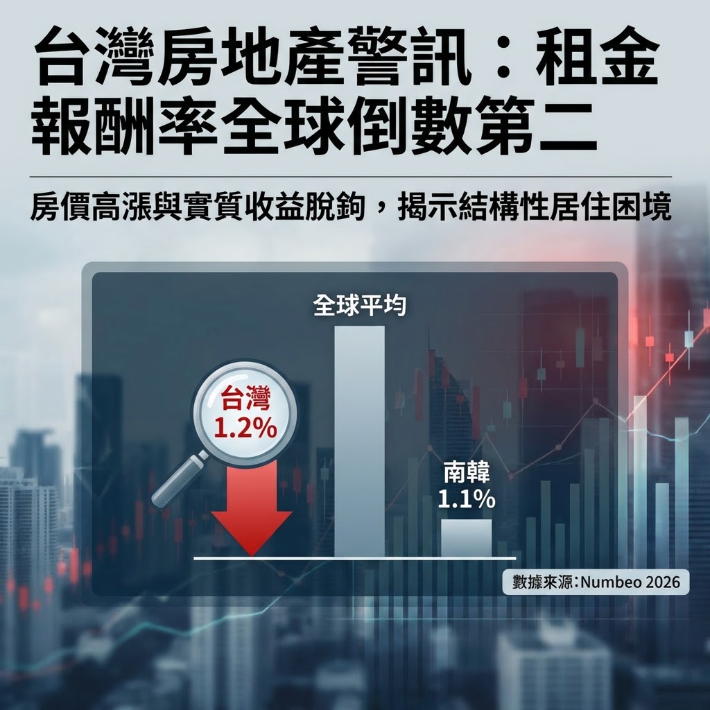 近期,一則關於台灣房地產市場的數據在全球社群上引發熱烈討論。根據全球數據庫 Numbeo 於 2026 年 2 月 17 日發布的最新統計顯示,台灣住宅租金報酬率僅 1.2%,在全球 112 個國家與地區中排名倒數第二,僅略高於南韓的 1.1%。這不僅是一個冰冷的數字,更深刻地揭示了台灣房地產市場長