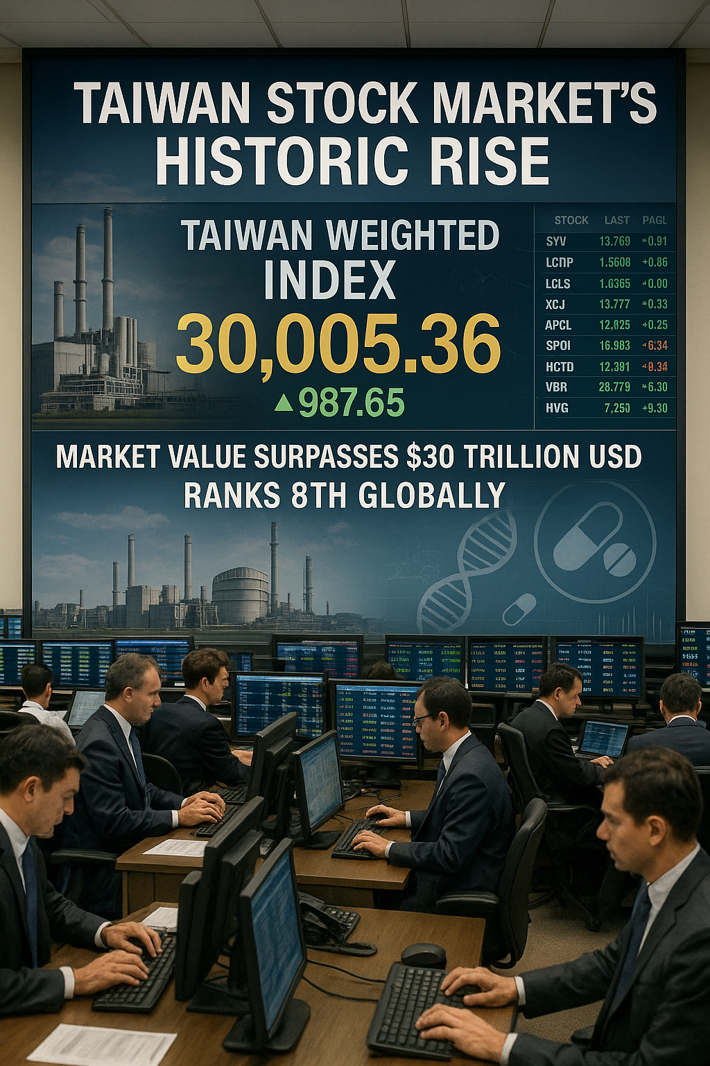 在2025年9月24日,台灣加權指數不斷上攻,帶動整體股市總市值一舉突破3兆美元大關,躍居全球第八大股市。