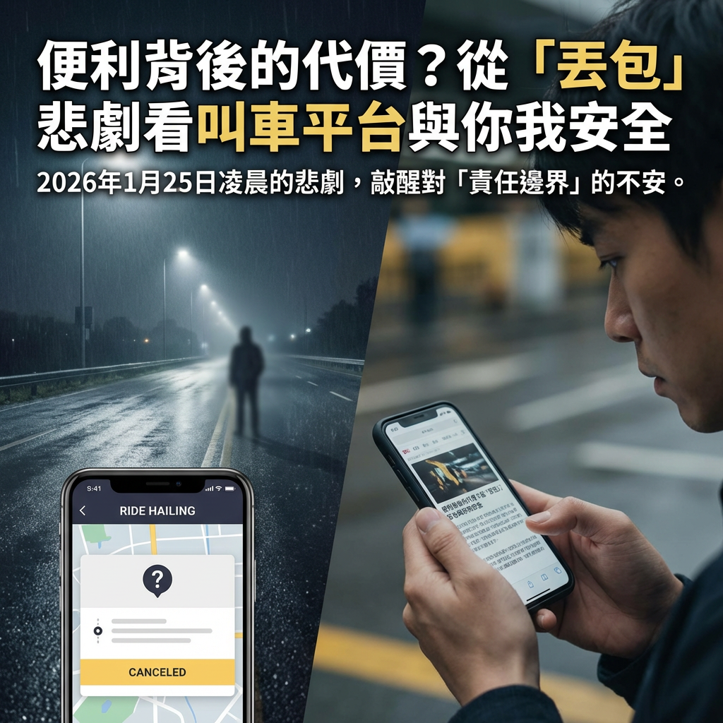 這幾天,一則令人心痛的消息,像一顆石頭投入平靜的湖面,激起陣陣漣漪。一位前途光明的25歲年輕人,在酒後搭乘叫車平台派遣的車輛返家途中,竟遭司機丟包於車水馬龍的快速道路上,最終不幸喪命。這樁發生在2026年1月25日凌晨的悲劇,不只是一則意外,更像一記重錘,敲醒我們對現代生活「便利」背後,那條模糊不清的「責任邊界」感到不安。