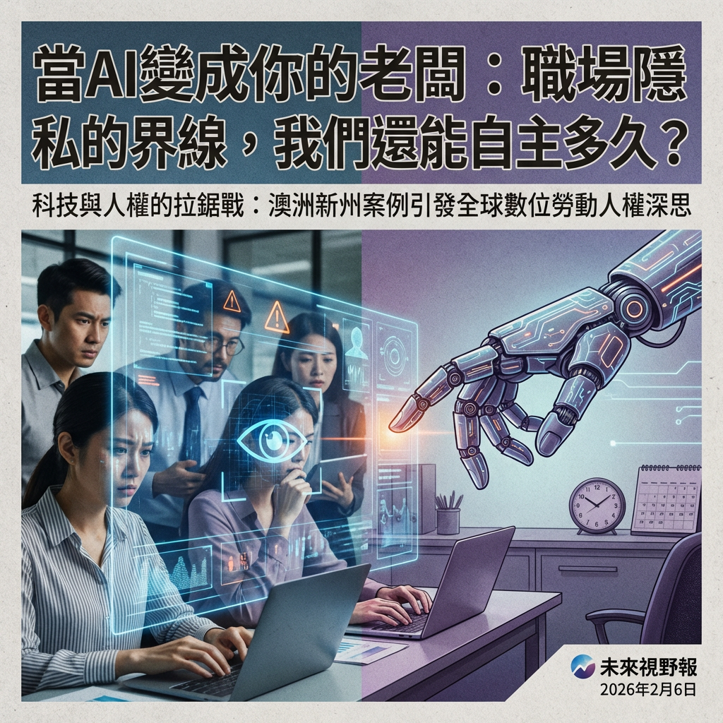 這不是科幻電影情節,而是來自大紀元在2026年2月6日的報導「AI進入職場引擔憂 新州擬賦工會更大監督權限」的真實寫照。報導揭示,澳洲新南威爾斯州(簡稱新州)工會聯合會的一項民調結果令人心驚:有高達29%的員工自稱正受到AI系統的監控,另外24%的人,連排班都由AI說了算。更令人深思的是,近四成的受訪者認為AI帶來的風險遠大於好處,而近七成人呼籲政府應更嚴格地監管AI。面對這股從基層竄起的憂慮,新州議會下院已通過一項法案,準備賦予工會更大的權限,讓他們可以查閱企業使用的AI軟體。這無疑是一場科技與人權的拉鋸戰,企業界馬上跳出來喊話,擔心這會變成工會的「監控權力」,甚至可能阻礙AI的創新投資,讓整個產業發展放慢腳步。