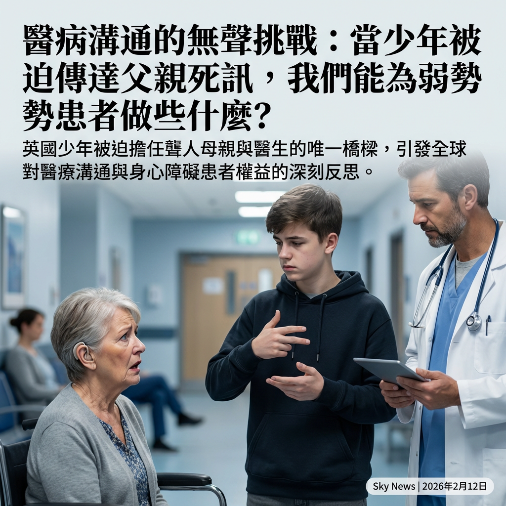 這起事件之所以引起廣泛關注,源於英國國家醫療服務體系(NHS)對聾人醫療服務的一份報告。該報告揭露了令人震驚的一幕:一名少年被NHS工作人員要求,親自向他失聰的母親轉達外公過世的消息。這份報導由《Sky News》於2026年2月12日披露,迅速在社群媒體上傳開,許多人都難以置信,在如此重要的醫學諮詢中,竟然會發生如此缺乏同理心的溝通失誤。報告指出,這不僅讓少年承受了不該有的心理重擔,也剝奪了聾人母親在關鍵時刻獲得專業、溫暖且直接醫療資訊的權利。這種狀況,無疑揭示了醫療系統在面對特殊需求患者時的巨大缺口,以及對專業口譯服務的輕忽。