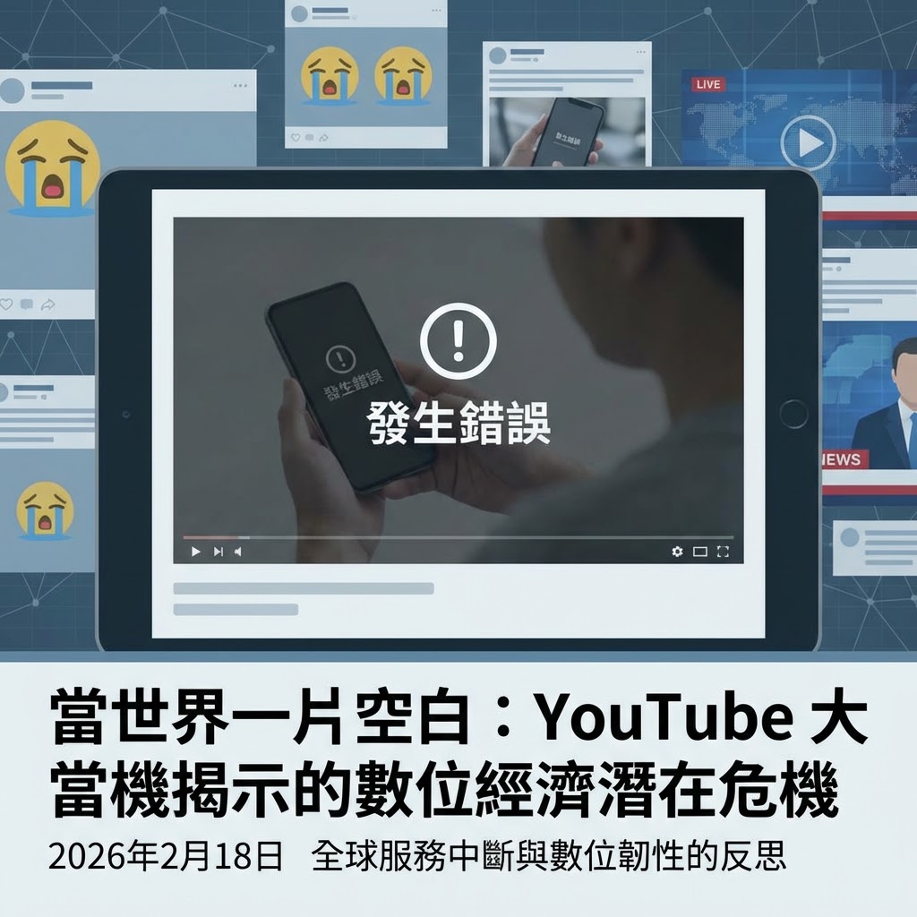2026年2月18日,農曆年初一,全球數百萬YouTube用戶經歷了一場突如其來的數位黑暗。從清晨開始,許多人發現首頁無法載入、影片播放頁面一片空白,伴隨著「發生錯誤」的提示訊息。社群媒體上瞬間湧入大量哀號聲,不少台灣網友紛紛崩潰,直呼「還我《後宮甄嬛傳》」或抱怨無法播放影片安撫小孩。這場全球性的服務中斷,絕非僅僅是技術故障這麼簡單。它是一次赤裸的展示,揭示了我們在數位化浪潮下,對少數網路巨頭過度依賴所面臨的潛在脆弱性。