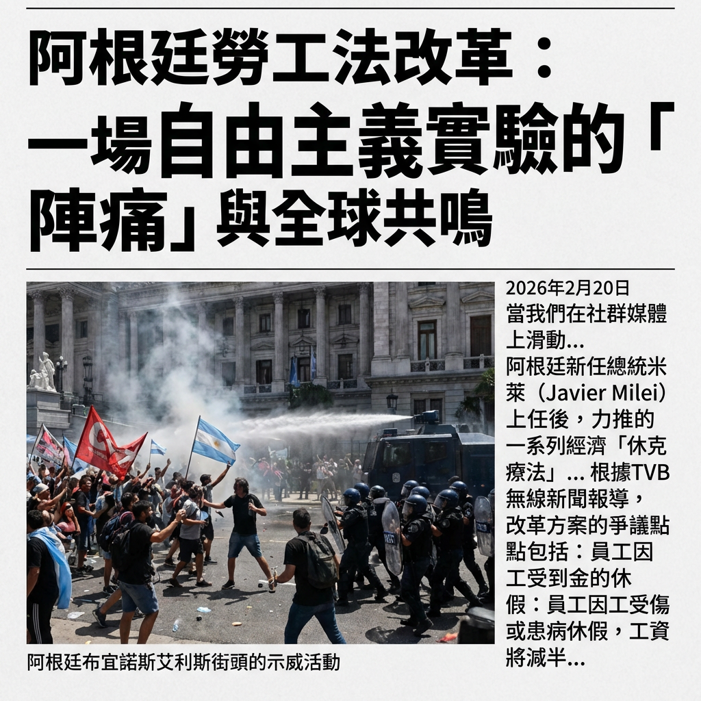回顧這波爭議的源頭,正是阿根廷新任總統米萊(Javier Milei)上任後,力推的一系列經濟「休克療法」。他的核心理念是透過大幅鬆綁管制、擁抱自由市場,來挽救阿根廷長期低迷的經濟。其中,修改勞工法被視為關鍵一步,旨在吸引外資、提升生產力。根據TVB 無線新聞2026年2月20日報導,改革方案的爭議點包括:員工因工受傷或患病休假,工資將減半;更限制了工會罷工的權力,甚至可能將法定工時從八小時提升至十二小時。這些提案在政府眼中是「鬆綁」與「活化」,但在許多勞動者眼中,卻是對基本權益的「剝奪」與「壓榨」。