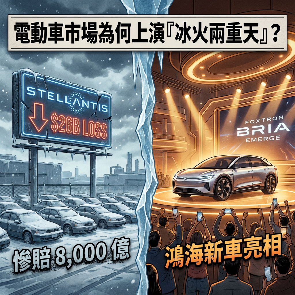 這兩天科技圈最震撼的消息,莫過於全球第四大車廠斯特蘭蒂斯(Stellantis)發布的驚人財報。這家擁有 Jeep、Peugeot 的巨頭,竟在 2025 年出現高達 260 億美元(約新台幣 8,300 億元)的虧損,並公開表示將「放棄」部分電動車策略。與此同時,台灣本土的鴻海集團旗下鴻華先進,卻在今日(3月1日)熱鬧舉辦 FOXTRON BRIA Emerge 試駕亮相,展現強大的造車決心。這種強烈的對比,正是 2026 年初全球車市最真實的寫照——「淘汰賽」已經正式槍響。