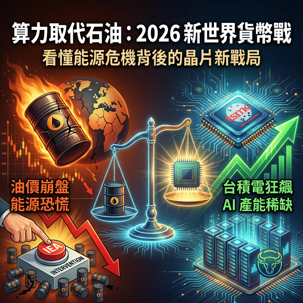 2026 年 3 月 11 日,全球市場上演了一場極具戲劇性的「冰火二重天」。一邊是中東地緣政治緊張導致能源恐慌,隨後國際能源總署(IEA)祭出史無前例的手段壓抑油價;另一邊,台灣的護國神山台積電卻無視總體經濟的動盪,股價大漲 40 元,帶動大盤狂飆 600 點。這看似矛盾的現象,其實揭示了當前科技產業最核心的趨勢:算力(Compute Power)正在取代石油,成為新的世界貨幣,但這兩者之間的愛恨糾葛才正要開始。