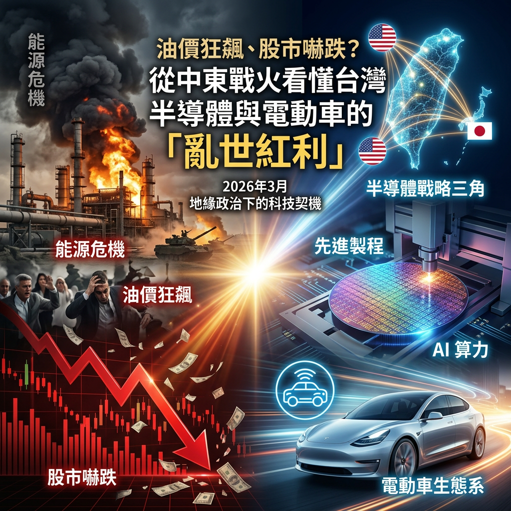 如果這兩天你有關注國際財經新聞,肯定會感受到一股山雨欲來的焦慮感。2026 年 3 月 21 日,全球股市籠罩在「能源危機」的陰影下,中東戰火延燒導致油價劇烈波動,甚至引發了歐美股市的連鎖下挫。然而,就在市場一片恐慌之際,台灣的科技產業卻在地球的另一端展現出截然不同的韌性與佈局。這不僅是一場資源戰爭,更是一次全球科技供應鏈的壓力測試。為什麼油價越貴,台灣的半導體與電動車戰略反而越清晰?讓我們撥開戰火的迷霧,看看背後的關鍵趨勢。