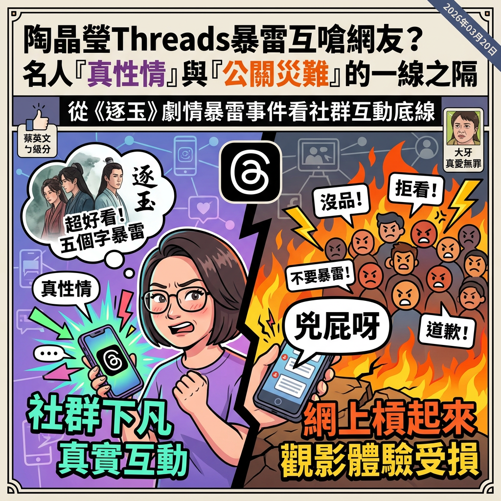 事情發生在 2026年03月20日,起因是最近 Netflix 上有一部陸劇《逐玉》紅到不行,連霸台灣榜冠軍,討論度高到連許多不看陸劇的人都入坑。結果身為追劇一員的陶晶瑩,疑似在 Threads 上太興奮,發了一篇只有五個字的貼文,直接把重要劇情爆雷了!這下可好,還沒看到的網友瞬間炸鍋,紛紛在底下留言抱怨被劇透。沒想到陶子姐也不是省油的燈,直接回嗆網友「兇屁呀」,這波操作瞬間讓話題延燒。