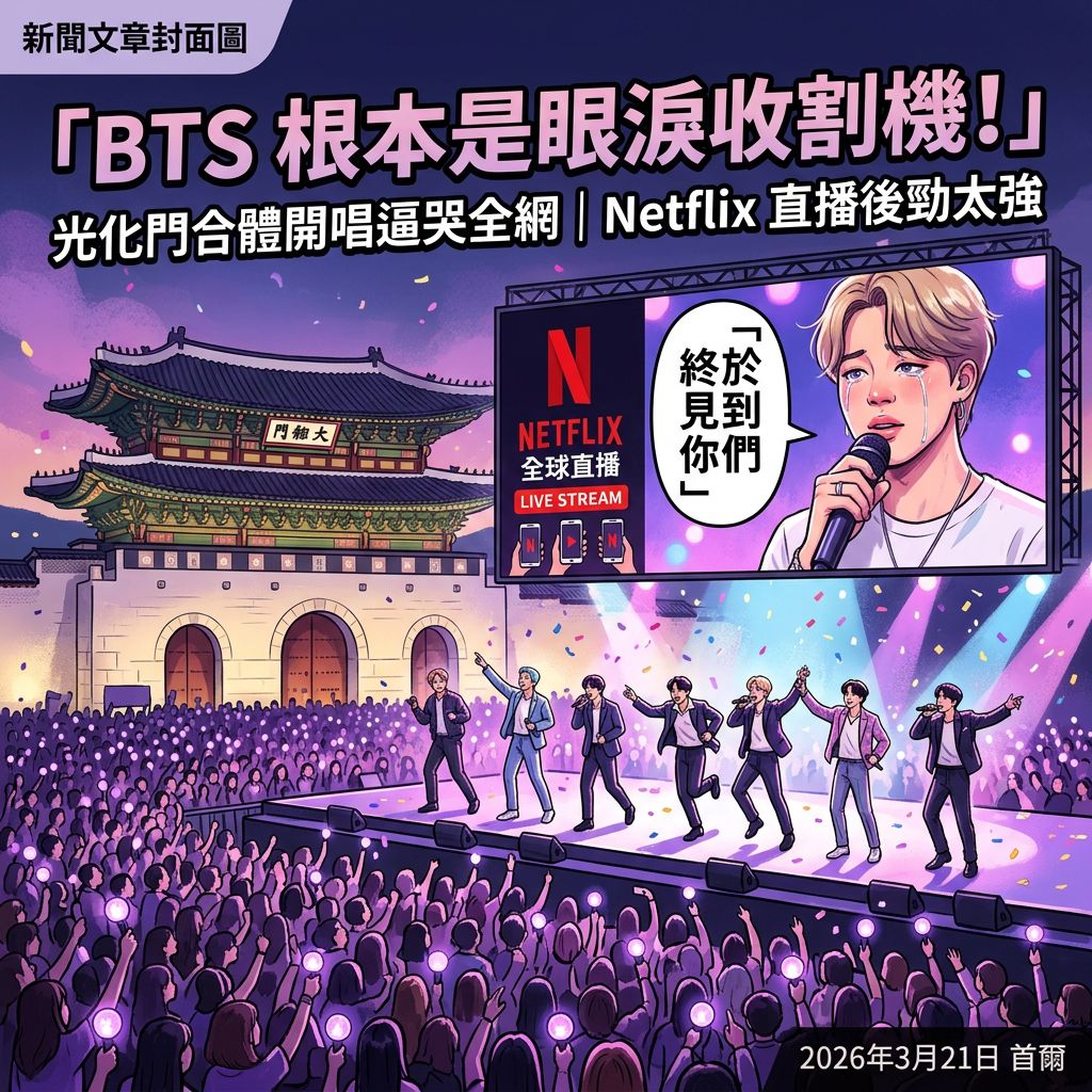 各位「阿米(ARMY)」們,昨天晚上大家的眼睛還好嗎?是不是跟我一樣,衛生紙用掉半包,隔著螢幕哭成淚人兒?這絕對是 2026 年開春以來最震撼的一晚!韓國天團 BTS 防彈少年團在經歷了軍白期後,終於在 2026年3月21日 於首爾光化門廣場強勢回歸。這次不只是現場塞爆,最狂的是直接登上 Netflix 全球直播,讓沒搶到票的我們也能零時差感受那股王者歸來的氣勢。這場演出的含金量與情感濃度實在太高,如果不聊聊這場「教科書等級」的回歸秀,真的說不過去!