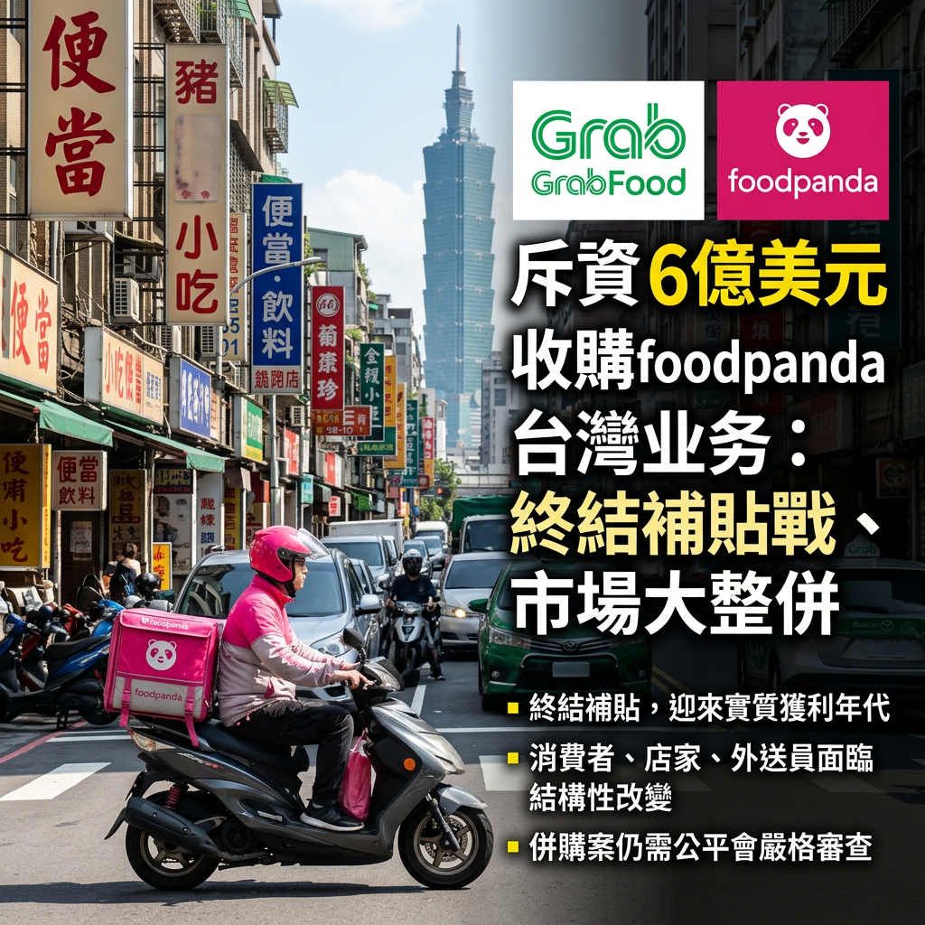 在這個講求效率與速度的時代,手機裡那個粉紅色的熊貓圖示,或許很快就要成為台灣人的集體回憶了。就在 2026年03月23日,財經圈爆出了一則震撼彈:東南亞叫車與外送巨頭 Grab 正式宣布斥資 6 億美元收購 foodpanda 的台灣業務。這不只是一樁商業併購案,更宣告了台灣外送平台長達數年的「補貼大戰」即將畫下休止符。當市場從「三國鼎立」走向「雙雄對決」甚至可能的一家獨大,這對每天依賴外送的上班族、苦撐餐飲業的小老闆,以及穿梭街頭的外送員來說,究竟意味著什麼?
