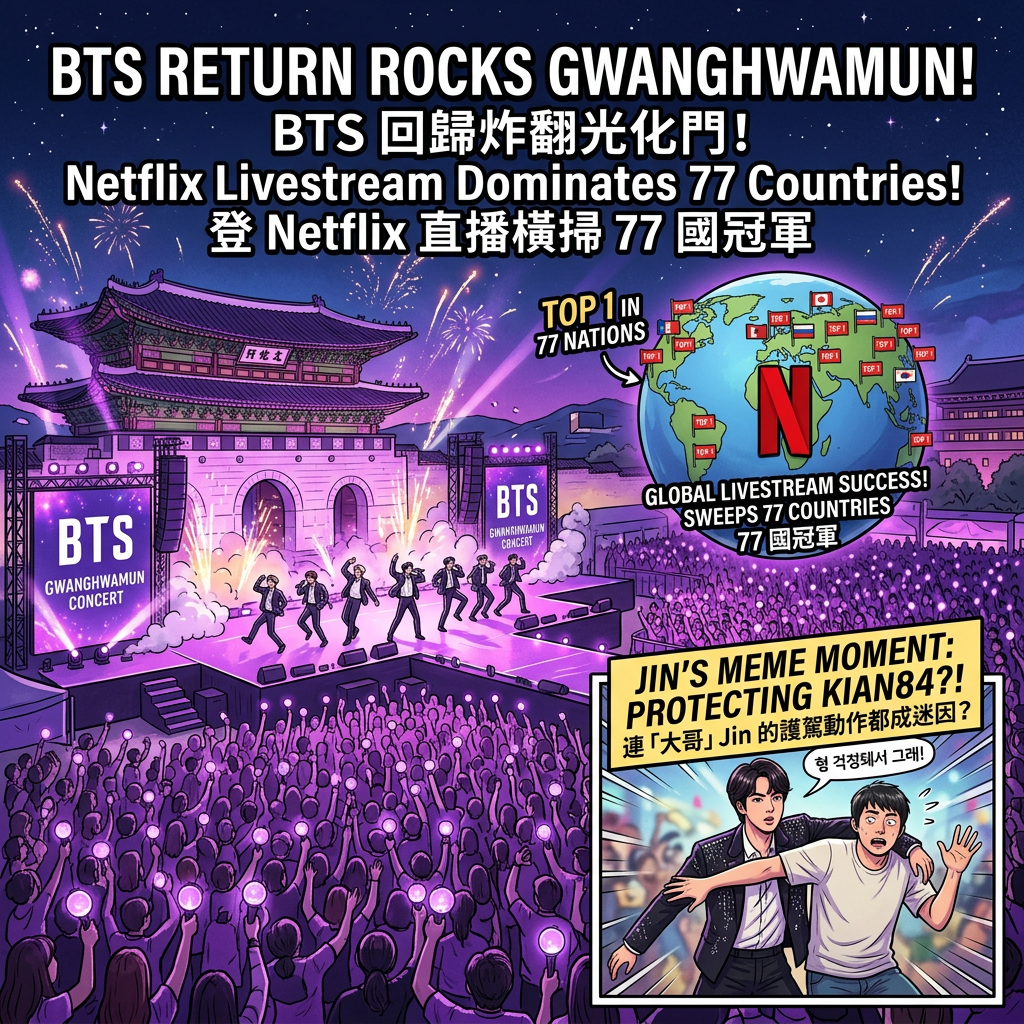 各位阿米(ARMY)們,你們的喉嚨還好嗎?或者該問,你們的 Netflix 帳號還好嗎?就在昨天,2026 年 3 月 23 日,全世界的社群媒體大概只有一種顏色,那就是「紫愛你」的紫色。這一天絕對會被寫進韓流歷史,因為我們的世界彈 BTS 防彈少年團,終於以完全體回歸了!而且這次不只是在韓國光化門現場塞爆 10 萬人,更首度與串流霸主 Netflix 合作全球直播,這波操作真的太神,不僅讓無法飛到韓國的粉絲能在第一時間掉淚尖叫,更直接用數據告訴全世界:王者回來了,地位依然無人能撼動。