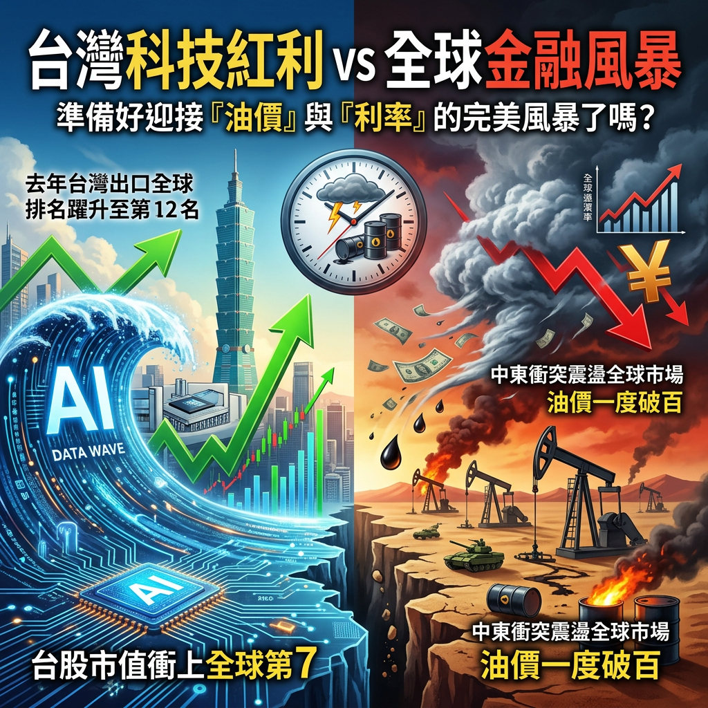 就在昨(24)日,台灣財經界迎來了一則令振奮的消息:受惠於 AI 人工智慧浪潮的強勁帶動,去年台灣出口全球排名躍升至第 12 名,寫下 32 年來的最佳紀錄。與此同時,我們的資本市場也不遑多讓,台股市值衝上全球第 7。然而,在這一片欣欣向榮的數據背後,全球金融市場卻正因為中東地緣政治的升溫而劇烈震盪。當我們沉浸在科技紅利的喜悅時,這篇文章想探討的是:台灣是否已經準備好迎接這場可能由「油價」與「利率」聯手掀起的完美風暴?