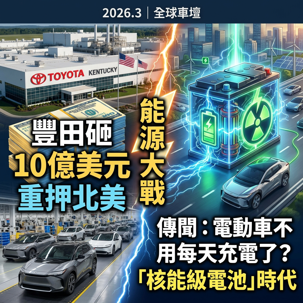 2026年3月25日,全球車壇與社群媒體同時被兩則看似截然不同的消息洗版。一邊是傳統車業霸主豐田(Toyota)宣布重磅消息,將在美國肯塔基州廠區加碼投資 10 億美元,全力鞏固其在北美電動車與油電市場的地位;另一邊,社群平台上則瘋傳著「充一次電用好幾年」的黑科技傳聞,宣稱電動車即將邁入 「核能級」時代。這兩件事放在一起看,恰好揭示了電動車產業正處於「務實量產」與「技術狂想」的十字路口。為什麼豐田選在此刻大動作出手?這些技術突破又將如何改變我們的生活?