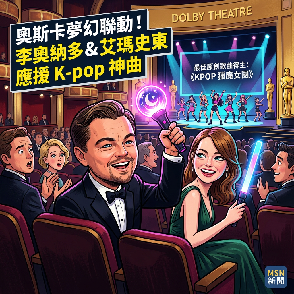 事情是這樣的,當晚典禮進行到原創歌曲表演環節,《KPOP 獵魔女團》的表演嘉賓一登場,全場氣氛瞬間像是在看演唱會。根據 MSN 新聞的報導,當這首神曲最終宣布奪下奧斯卡大獎時,導播鏡頭很懂地掃過台下觀眾席,結果竟然捕捉到李奧納多和新科影后艾瑪史東(Emma Stone)手上拿著該團體的專屬手燈,跟著節奏揮動。這畫面一出,Threads 上直接炸鍋,網友紛紛截圖瘋傳,有人笑說「李奧納多這熟練度一看就是有練過」、「艾瑪史東根本是站姊等級的表情」。這不僅打破了奧斯卡一向給人「高冷」的印象,也讓人驚呼原來大明星們私底下可能也是會在客廳跳 Cover Dance 的凡人啊!可以參考這篇報導:寫下紀錄!《KPOP 獵魔女團》神曲奪奧斯卡 李奧納多、 艾瑪史東台下揮手燈。