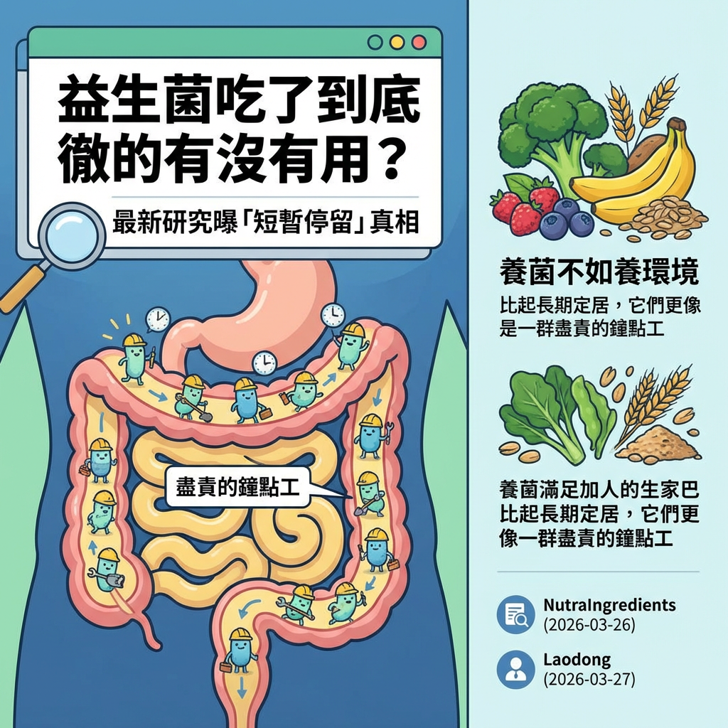 根據 2026 年 3 月 26 日發布的最新外電報導,知名營養學權威媒體《NutraIngredients》刊登了一項最新研究,指出益生菌飲品對於改善健康成人的「稀便」(loose stools)傾向有顯著效果。這項研究證實了益生菌在緩解腸道敏感、腹瀉問題上的即時效力。然而,同一時間,另一則來自《Laodong》的健康專題則拋出了一個更本質的靈魂拷問:「益生菌在體內到底能存活多久?」
