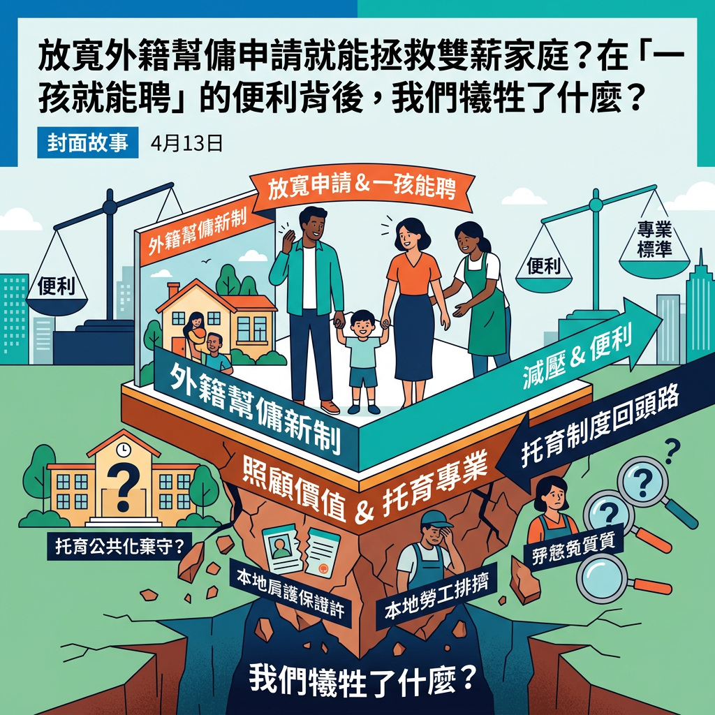 這就像是在天秤的兩端,一端是家長的便利,另一端是專業照顧的堅持與本地勞工的生計,政府試圖用「廉價外力」來平衡,卻可能導致整個托育生態系的崩解。
