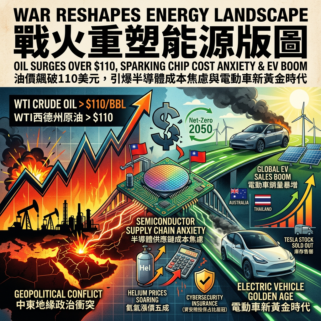 2026年4月3日,全球市場迎來了一次劇烈的震盪。受到中東地緣政治衝突加劇的影響,國際油價單日暴漲逾11%,一舉突破110美元大關。這不僅僅是加油站裡跳動的數字,更是一場正在重塑全球科技與產業供應鏈的連鎖風暴。當我們還在關注AI應用的飛速發展時,底層的能源與原物料危機已經悄悄逼近。為什麼這件事值得每