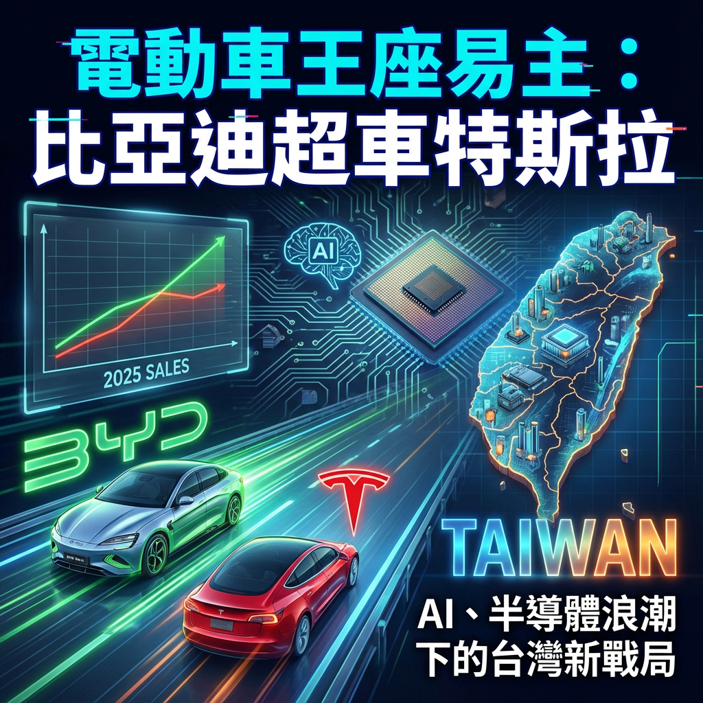 近期全球科技產業熱鬧非凡,特別是在2026年1月5日,關鍵評論網報導比亞迪已於2025年銷售量超越特斯拉,正式登上全球電動車銷售冠軍寶座。這不只是一個單純的市場排名變動,更是預示著全球科技產業板塊挪移的關鍵訊號。隨著全球消費性電子大展(CES 2026)的序幕即將拉開,從AI眼鏡到智慧製造,從先進半