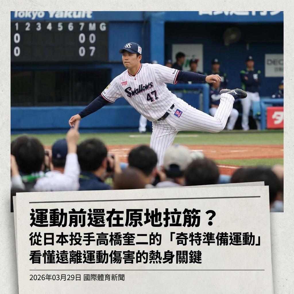 每到週末,河堤邊與健身房裡總有許多趁著休假出外活動筋骨的民眾。但你是否注意過,多數人在運動前,通常只是隨意轉轉手腕、彎腰碰個腳趾,就急著開始劇烈活動。這樣的習慣,往往是肩頸拉傷、肌肉撕裂或膝蓋發炎的元凶。在2026年03月29日的國際體育新聞中,一則關於日本職棒養樂多燕子隊投手高橋奎二的報導引起了廣
