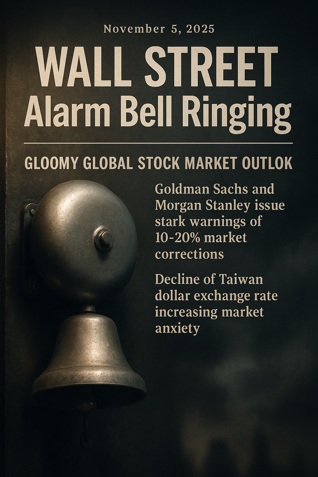 華爾街的警鐘響起,全球股市的未來似乎蒙上了一層陰影。就在今日,2025年11月5日,兩大國際金融巨頭——高盛與摩根士丹利同步發出嚴峻警示,指出全球股市可能面臨高達10%至20%的回檔修正。這項消息如同投下一顆震撼彈,恰逢新台幣匯率持續走貶,加劇了市場的不安情緒。