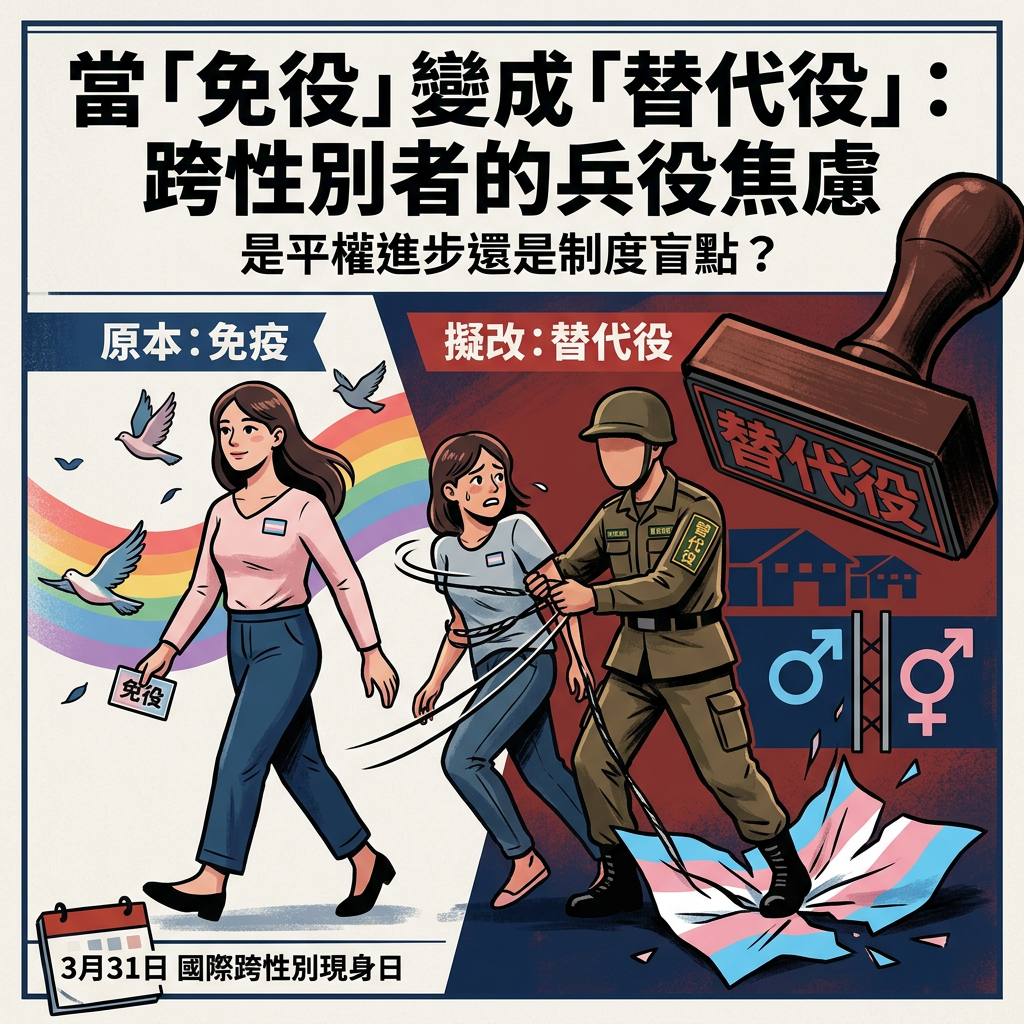 每年的3月31日是國際跨性別現身日,原本該是慶祝多元與勇敢的日子,近年卻蒙上了一層焦慮的陰影。政府日前預告修正「體位區分標準」,打算將跨性別者的兵役狀態從原本的「免役」改為「替代役」。這項看似只是行政規範微調的舉動,立刻在社群上引發了軒然大波。這件事之所以值得我們停下來深思,是因為它不單純是兵役制度