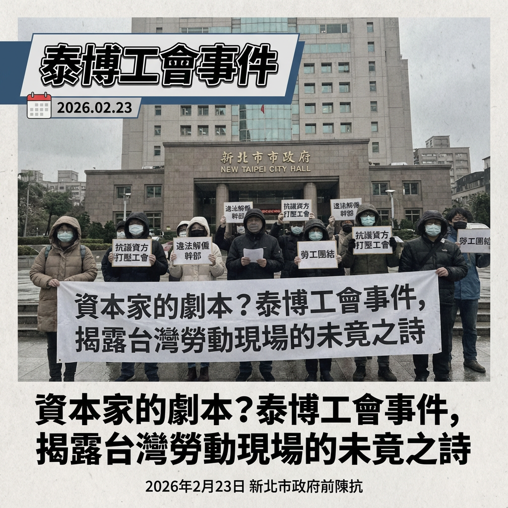 2026年2月23日,一場在寒風中舉行的陳抗,再度敲響了台灣勞動現場的警鐘. 泰博科技工會的成員們,聚集在新北市政府前,高舉標語、聲嘶力竭地控訴資方打壓工會,甚至違法解僱幹部. 這不僅是單一企業與員工的勞資糾紛,更像是一面照妖鏡,映照出潛藏在光鮮經濟數據背後,那道關於勞工權益、工會自主,乃至於移工處