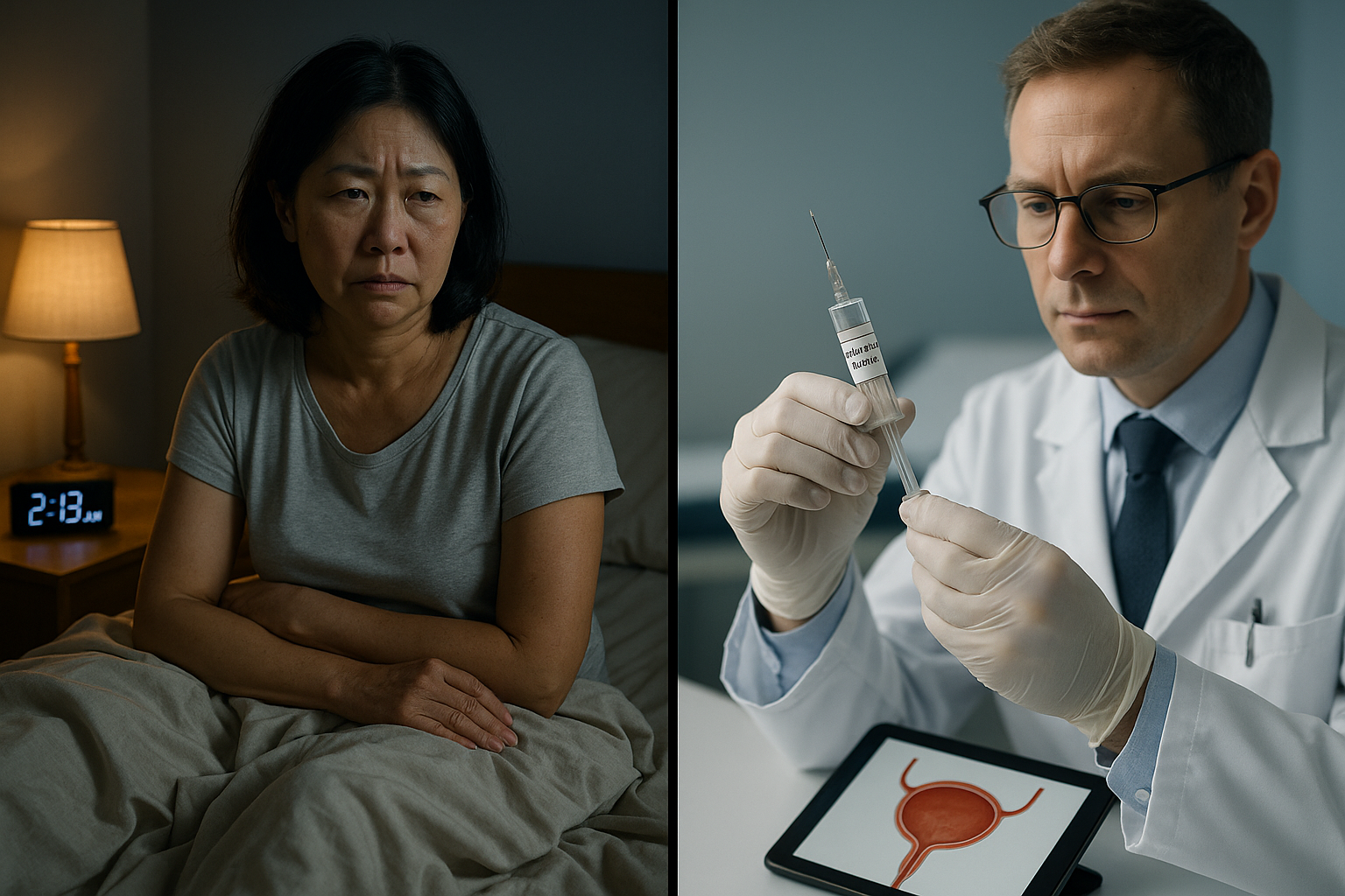 半夜被尿意叫醒已經成了不少更年期女性與中老年人的共同經驗。床頭燈一開,手機時間一看,原本想多睡一會兒的念頭被打散,隔天上班、帶小孩或照護長輩的精力也跟著受影響。最近媒體熱炒一個「1針肉毒桿菌進膀胱」的新解方,引發社群討論:這是真療法還是噱頭?。為什麼這個議題突然爆紅?主要是因為治療方式聽起來既簡單又