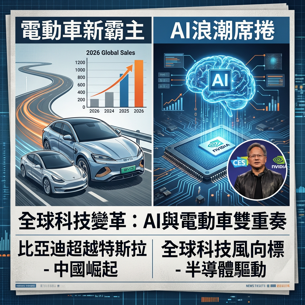 近期全球科技產業熱鬧非凡,特別是在2026年1月5日,關鍵評論網報導比亞迪已於2025年銷售量超越特斯拉,正式登上全球電動車銷售冠軍寶座。這不只是一個單純的市場排名變動,更是預示著全球科技產業板塊挪移的關鍵訊號。隨著全球消費性電子大展(CES 2026)的序幕即將拉開,從AI眼鏡到智慧製造,從先進半