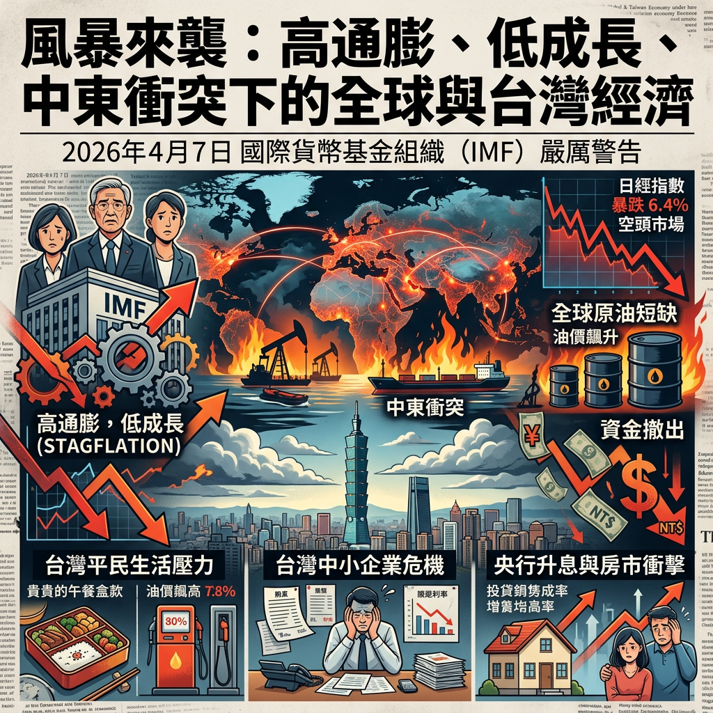 2026年4月7日,國際貨幣基金組織(IMF)對全球經濟發出了「高通膨、低成長」的嚴厲警告,而引發這場風暴的源頭,正是持續升溫的中東地緣衝突與飆升的油價。就在同一天,日經指數應聲暴跌6.4%,正式步入空頭市場,市場對於美國貨幣政策的恐慌情緒正在全球蔓延。這不僅僅是華爾街或國際政客該煩惱的事,當全球能