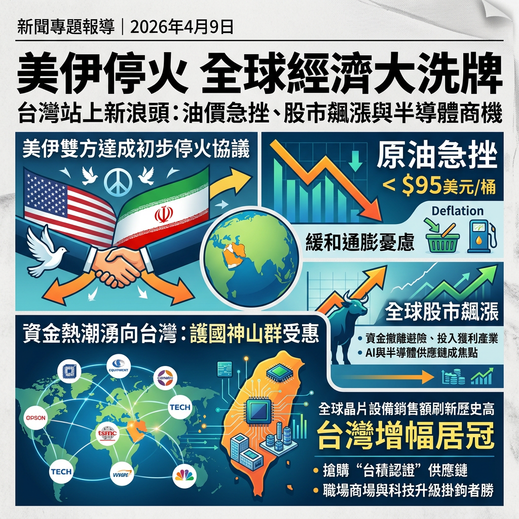就在昨天,全球金融市場集體鬆了一口氣。隨著美伊雙方達成暫時停火協議的消息傳出,全球股市立刻上演慶祝行情,國際油價更是一度急挫跌破九十五美元大關。根據 Yahoo股市 在2026年4月9日的報導,這波停火不僅讓全球股市飆漲,更大幅緩和了市場對於通膨失控的憂慮。而作為台灣科技業風向球的台積電,其ADR也