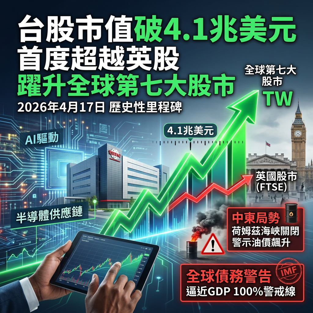 2026年4月17日,台灣資本市場迎來了一個歷史性的里程碑。根據最新數據,台灣股市的總市值已經正式突破4.1兆美元,成功將昔日的老牌金融強權擠下去,台股市值破4.1兆美元 首度超越英股,躍升為全球第七大股市。這絕對不只是一個讓股民開心一天的虛榮數字,而是深刻反映出全球資金板塊正在發生劇烈的重組,這場