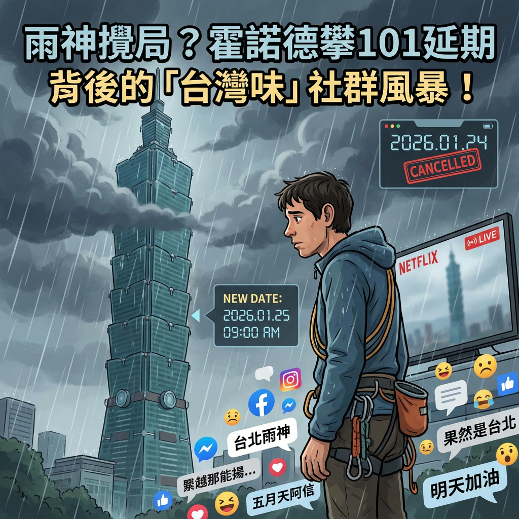 嘿,各位追劇、追星、追熱點的娛樂好友們!這幾天,大家最期待的年度大戲,恐怕不是哪部影集上線,而是「自由攀岩傳奇」艾力克斯.霍諾德(Alex Honnold)徒手挑戰台北101的世紀直播。 結果勒? 就在全球觀眾屏息以待的2026年1月24日,一陣「台北雨」直接把這場史詩級直播給喊卡了!這消息一出,立