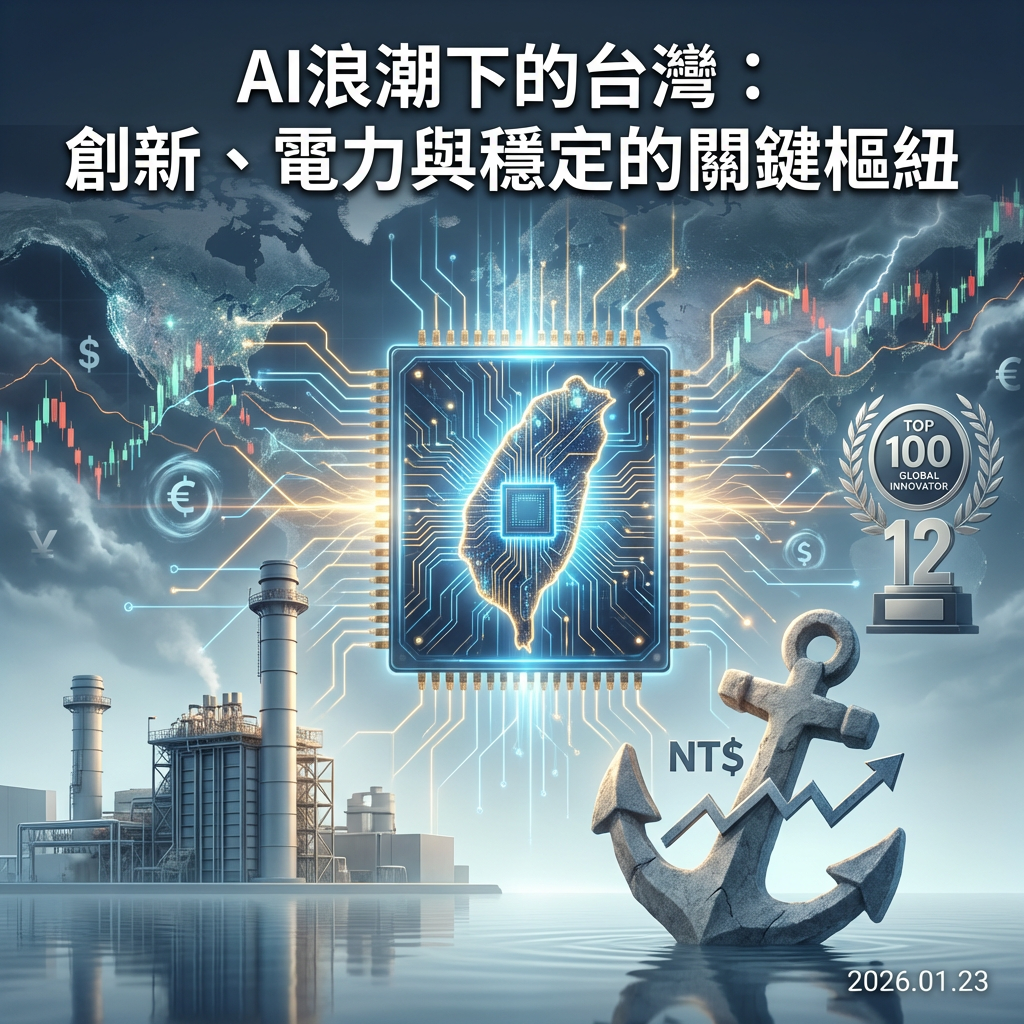 在今日(2026年1月23日)全球經濟瞬息萬變的局勢中,有兩則看似不相關的新聞,實則巧妙地勾勒出台灣在全球供應鏈中獨特的關鍵地位。一方面,我們看到台灣在全球百大創新機構的評選中再次蟬聯全球第三,並有台積電、鴻海、台達電等12家台灣企業入選,這無疑是對台灣創新實力的肯定。另一方面,台電為了因應人工智慧